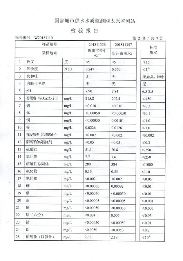 2018年忻州城區(qū)公共供水南水廠、云中水廠出廠水106項(xiàng)水質(zhì)全分析信息公示