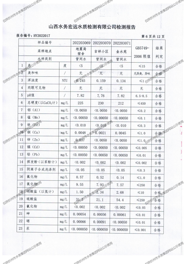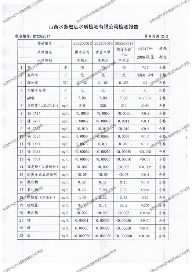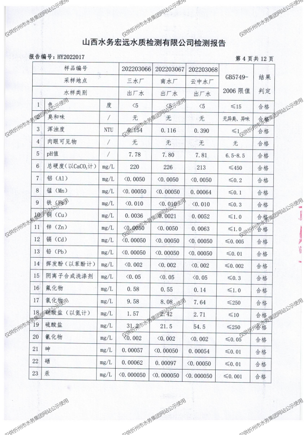 忻州城區(qū)公共供水水源水、出廠水、管網(wǎng)水、管網(wǎng)末梢水2022年3月份水質(zhì)信息公示